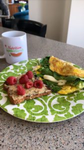 · 1 cup blueberries + spinach · 1 piece of whole grain toast |
